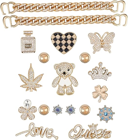 Including 19 exquisite shoe decorations, 2 gold chains with diamond elements, 1pc bling crown, 1pc QUEEN, 1pc LOVE, 3pcs maple leaves, 1pc adorable bears, 1pc heart, 2pcs snowflakes, 1pc sapphire rudder, and 4 small gold accessories.