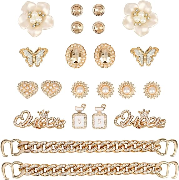 Including 22 exquisite shoe decorations, 2 gold chains with diamond elements, 2pcs of QUEEN, 2 heart-shaped elements with pearl accents, 2 large flowers, 2 perfume-inspired accessories, 2 butterfly elements, 2 large oval gold accents, 4 sun-shaped elements with pearl accents, and 4 small gold accessories.